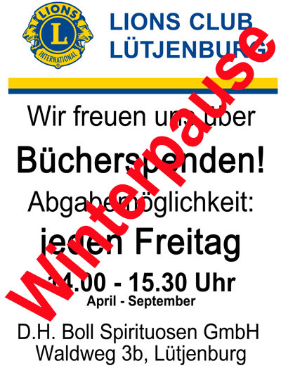 Die beliebten Büchermärkte auf dem Lütjenburger Marktplatz werden auch weiterhin wie bisher fortgeführt. Der Club nimmt ab dem Frühjahr wieder Bücherspenden an und freut sich auf seine lesehungrigen Käufer.